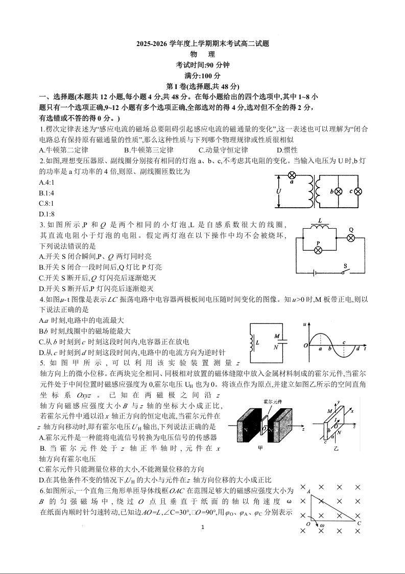 高二物理--辽宁省协作体2025-2026学年高二上学期期末考试