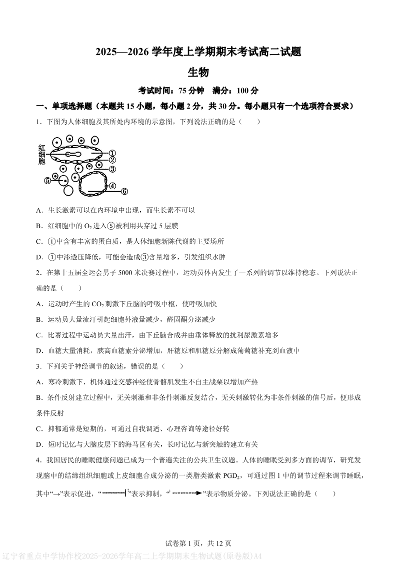 高二生物(原卷版)--辽宁省协作体2025-2026学年高二上学期期末考试