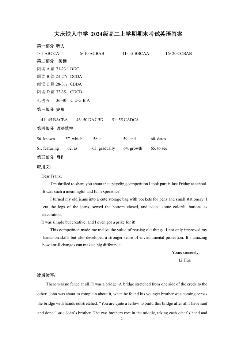 高一英语答案--黑龙江省大庆铁人中学2025-2026学年高二上学期期末考试