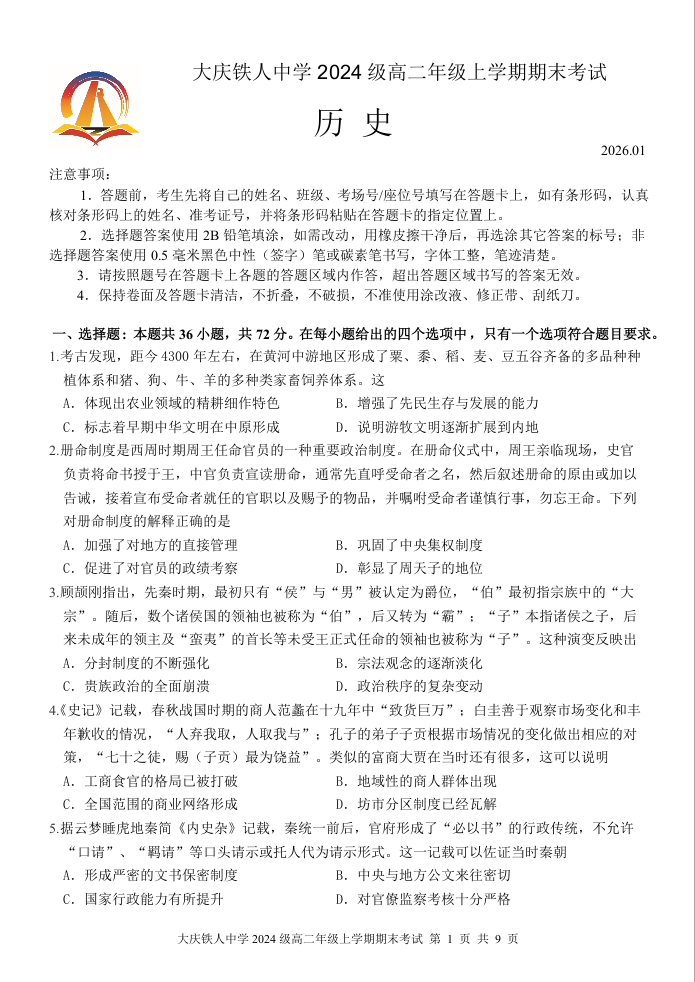 高二历史--黑龙江省大庆铁人中学2025-2026学年高二上学期期末考试