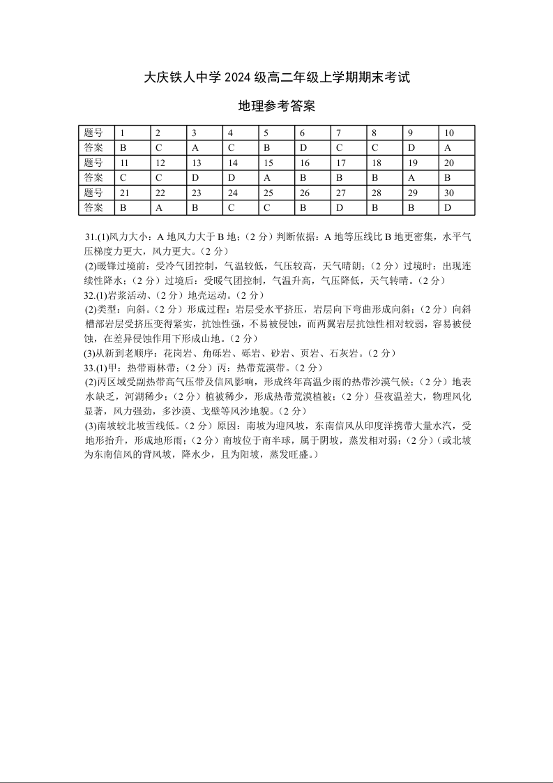 高二地理答案--黑龙江省大庆铁人中学2025-2026学年高二上学期期末考试