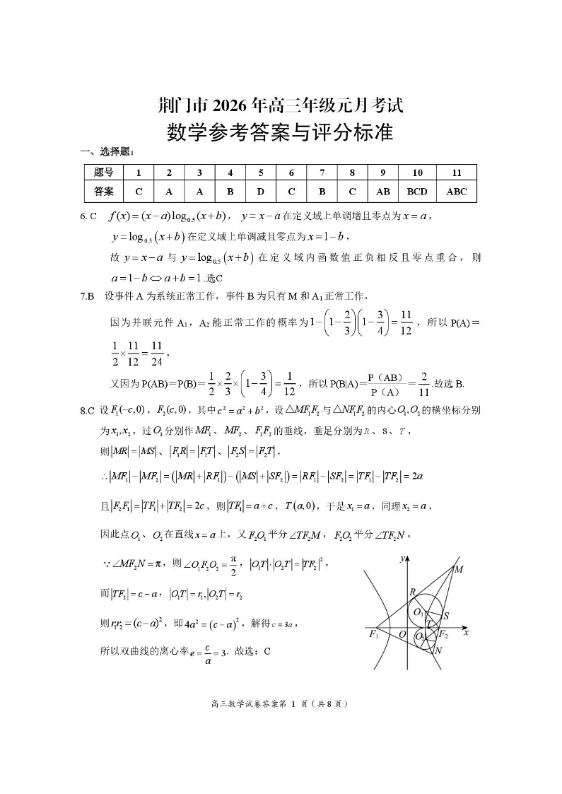 高三数学答案--湖北省荆门市2026届高三上学期元月考试