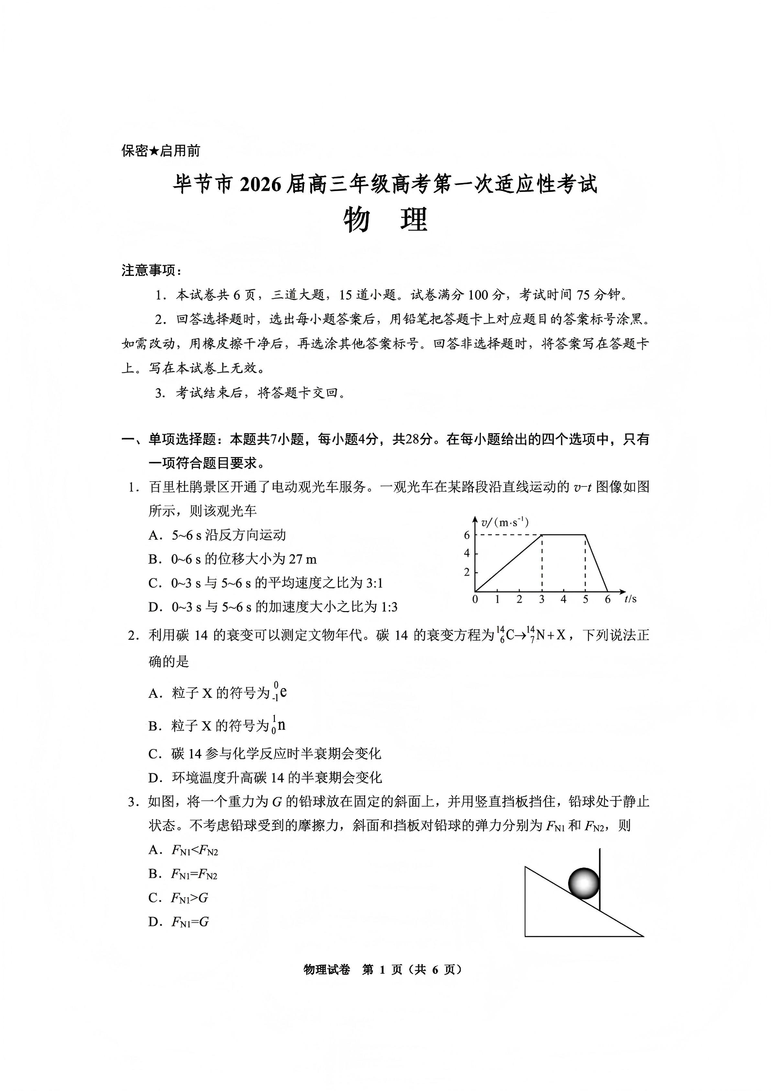 高三物理--贵州省毕节市2026届高三年级高考第一次适应性考试(毕节一诊)