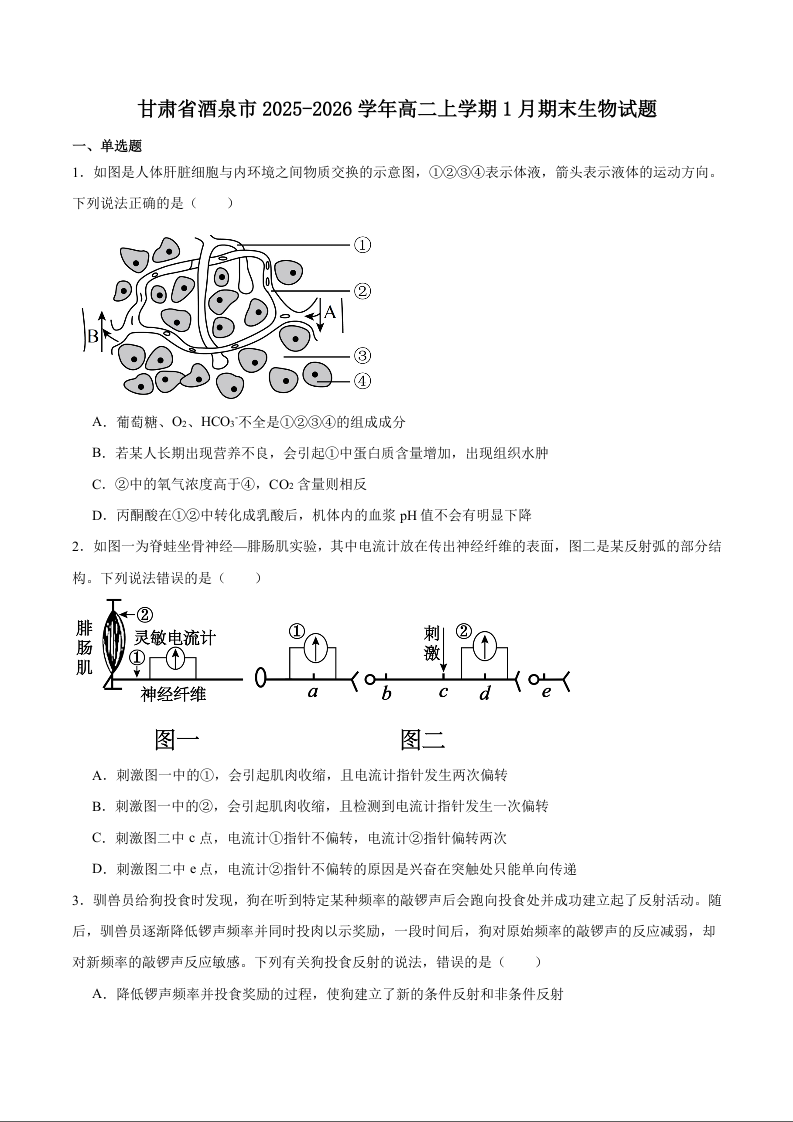 高二生物+答案--甘肃省酒泉市普通高中2025-2026学年高二上学期1月期末考试