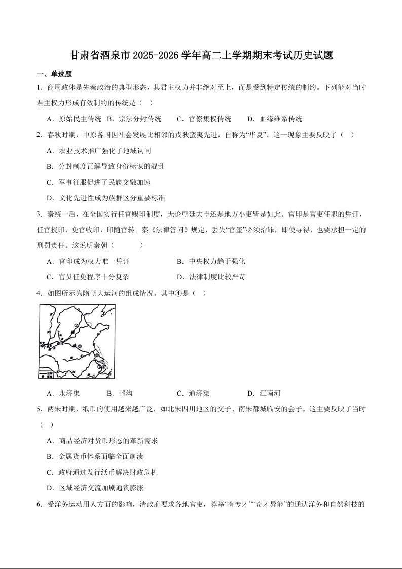高二历史+答案--甘肃省酒泉市普通高中2025-2026学年高二上学期1月期末考试