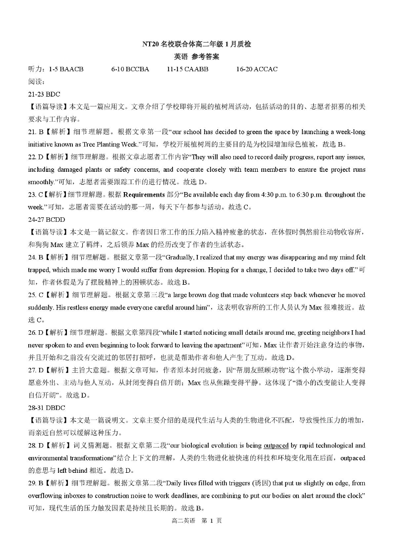 高二英语答案--河北省邯郸市NT20名校联合体2025-2026学年高二上学期1月质检