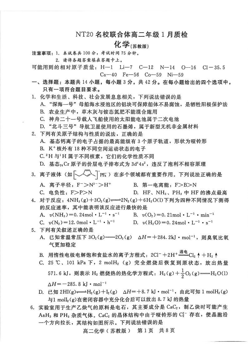 高二化学--河北省邯郸市NT20名校联合体2025-2026学年高二上学期1月质检