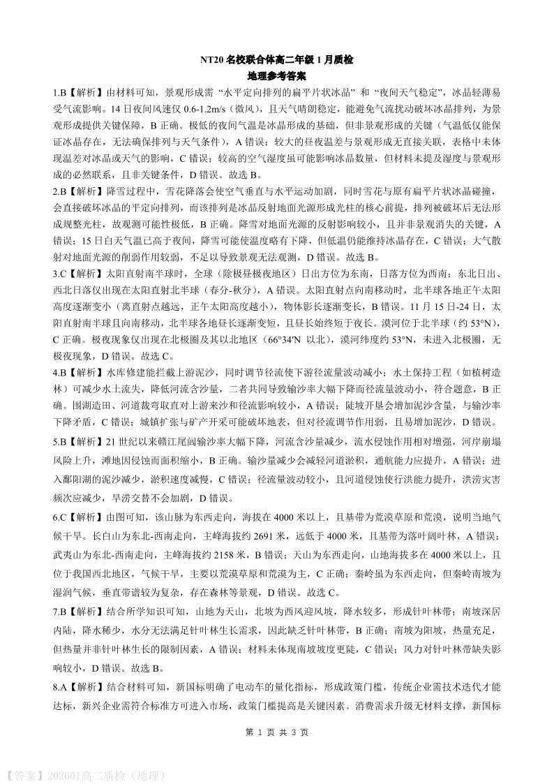 高二地理答案--河北省邯郸市NT20名校联合体2025-2026学年高二上学期1月质检