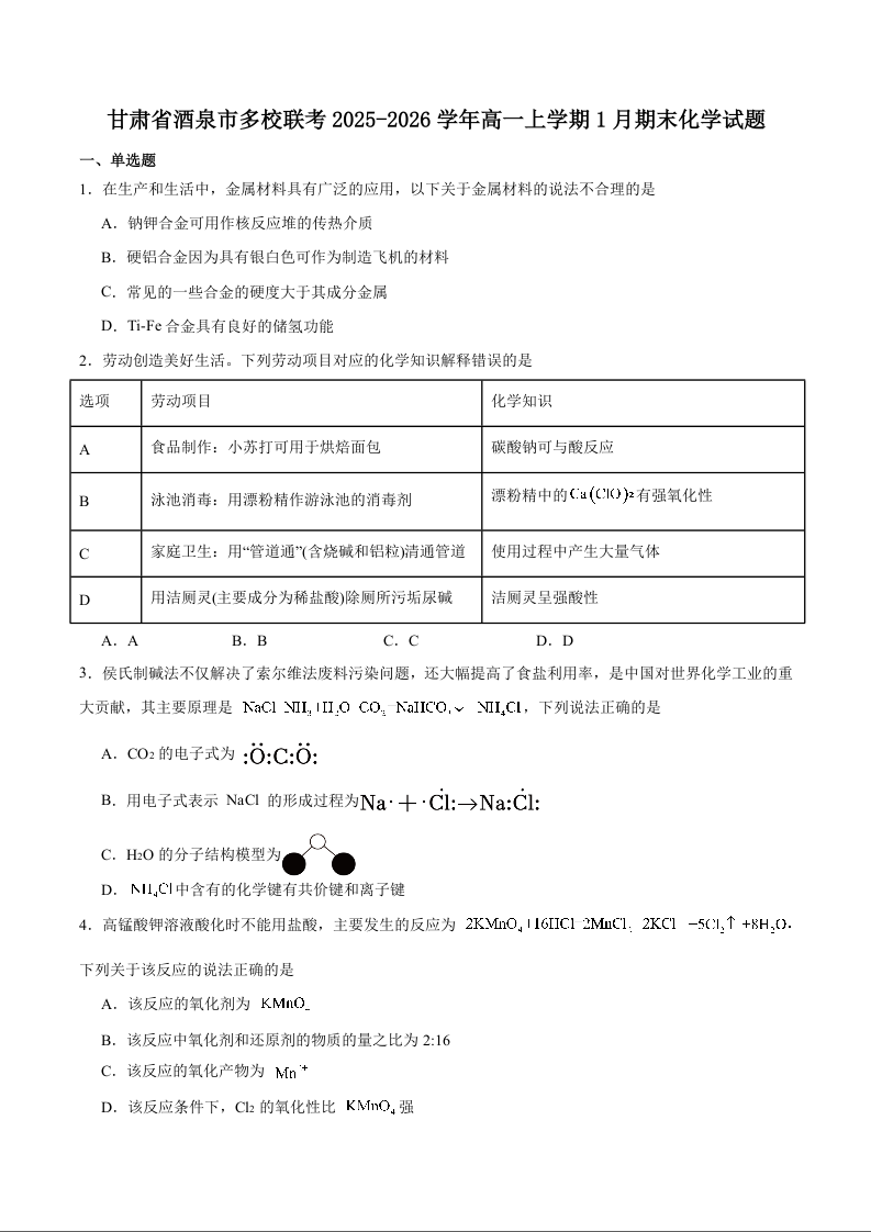高一化学+答案--甘肃省酒泉市普通高中2025-2026学年高一上学期1月期末考试