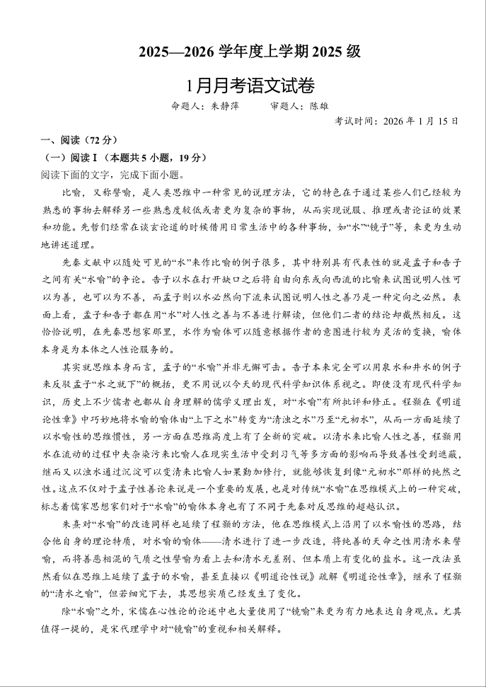 高一语文+答案--湖北省荆州市沙市中学2025-2026学年高一上学期1月月考