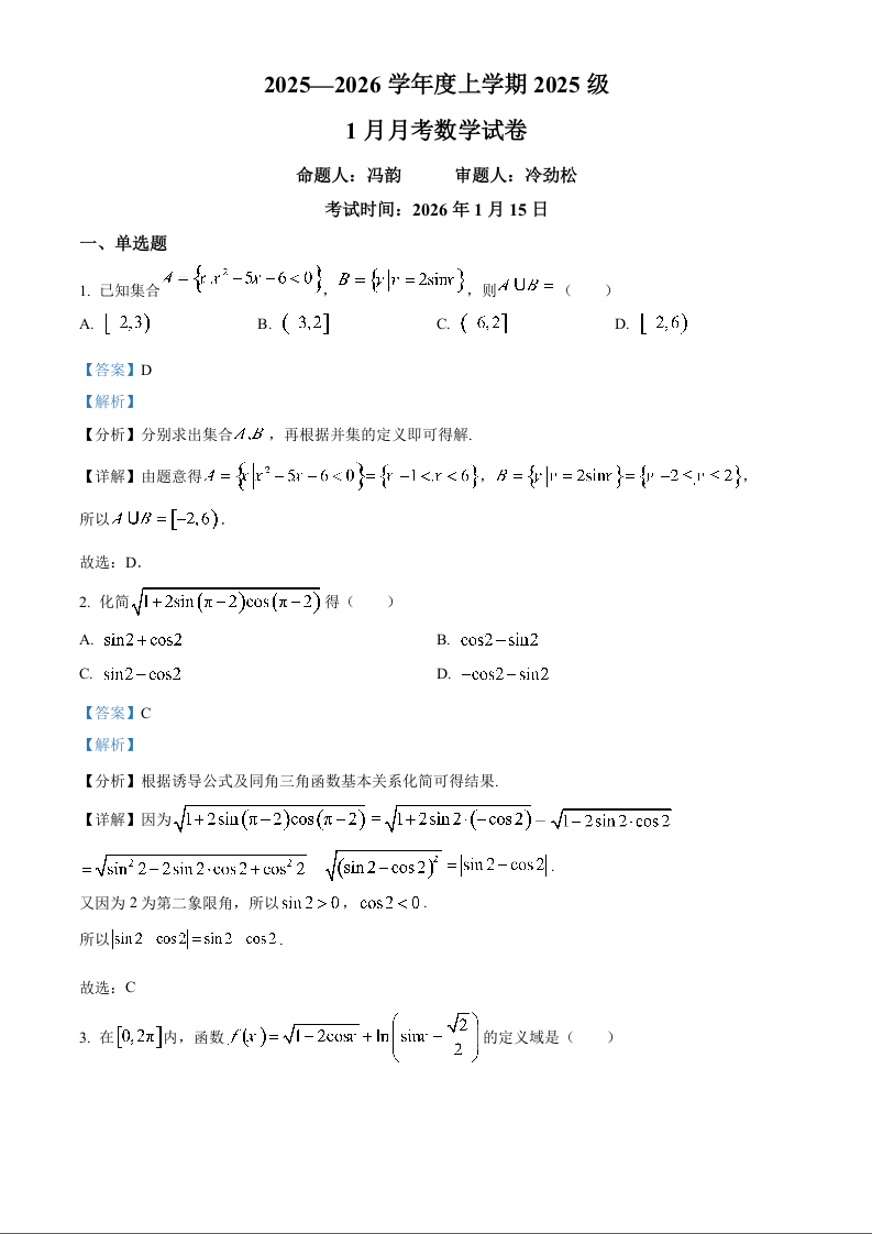 高一数学(解析版)--湖北省荆州市沙市中学2025-2026学年高一上学期1月月考