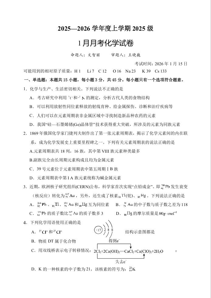 高一化学+答案--湖北省荆州市沙市中学2025-2026学年高一上学期1月月考