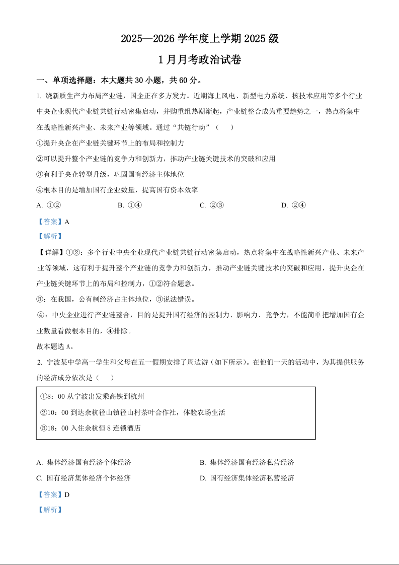 高一政治(解析版)--湖北省荆州市沙市中学2025-2026学年高一上学期1月月考