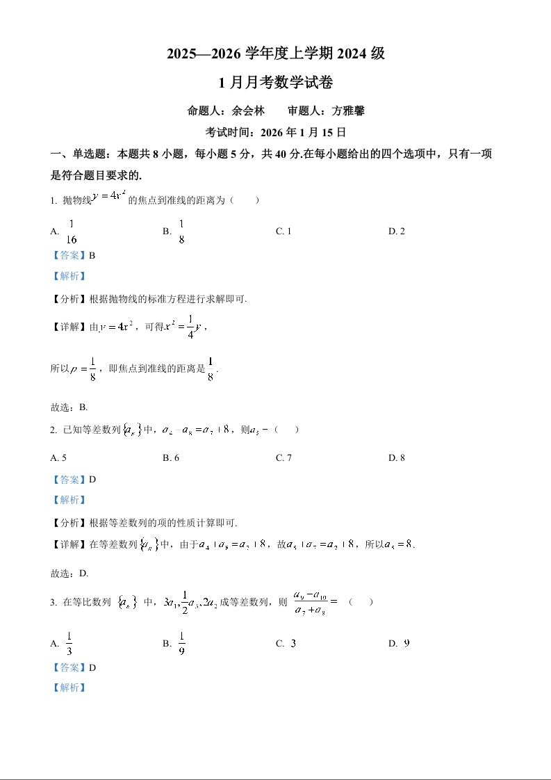 高二数学(解析版)--湖北省荆州市沙市中学2025-2026学年高二上学期1月月考