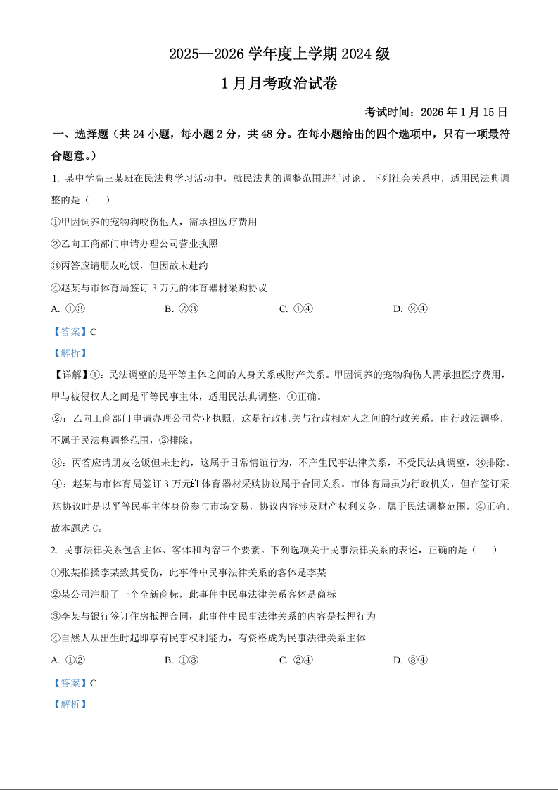 高二政治(解析版)--湖北省荆州市沙市中学2025-2026学年高二上学期1月月考