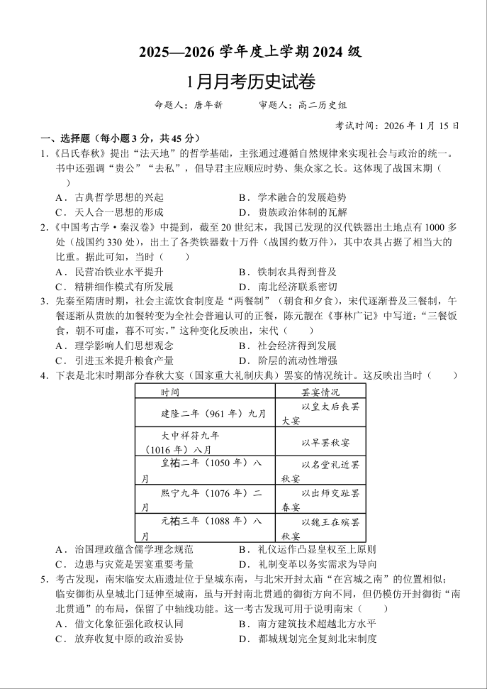 高二历史+答案--湖北省荆州市沙市中学2025-2026学年高二上学期1月月考
