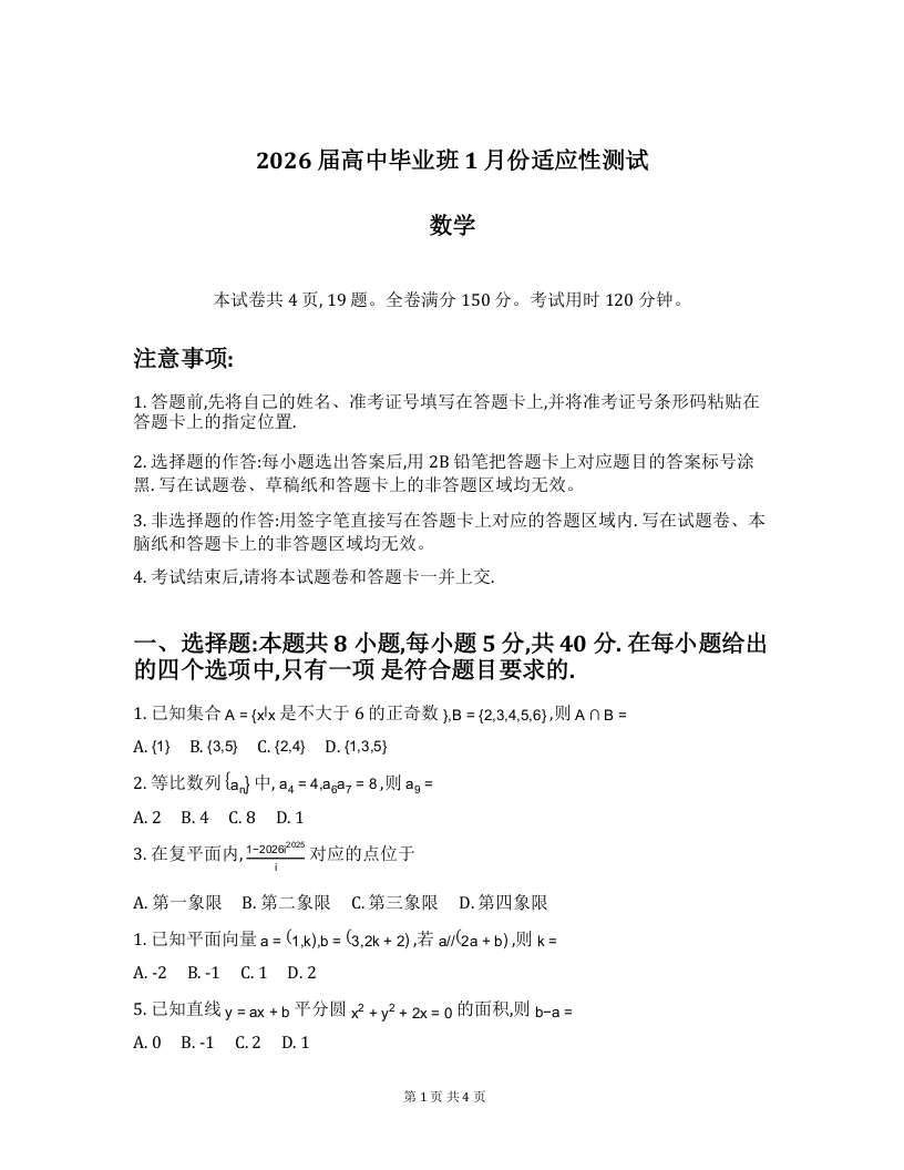 高三数学--广西玉林市2026届高中毕业班1月份适应性测试