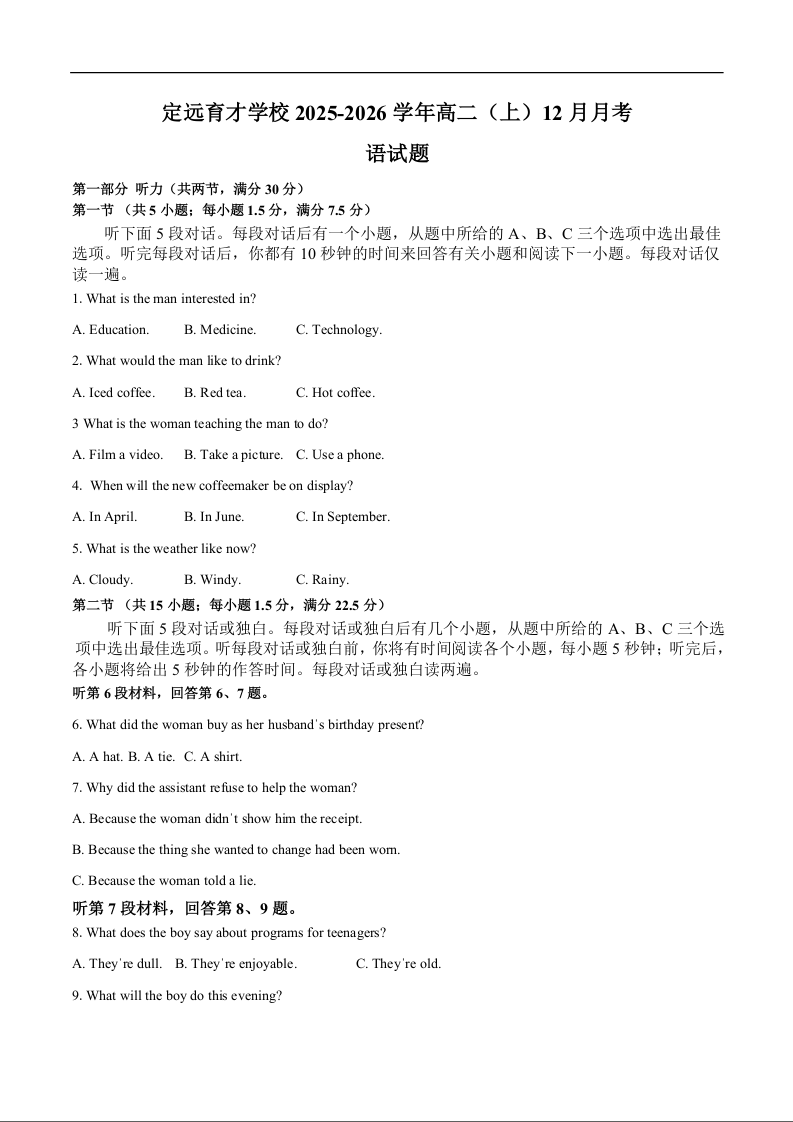 高二英语+答案--安徽省滁州市定远县育才学校2025-2026学年高二上学期12月月考