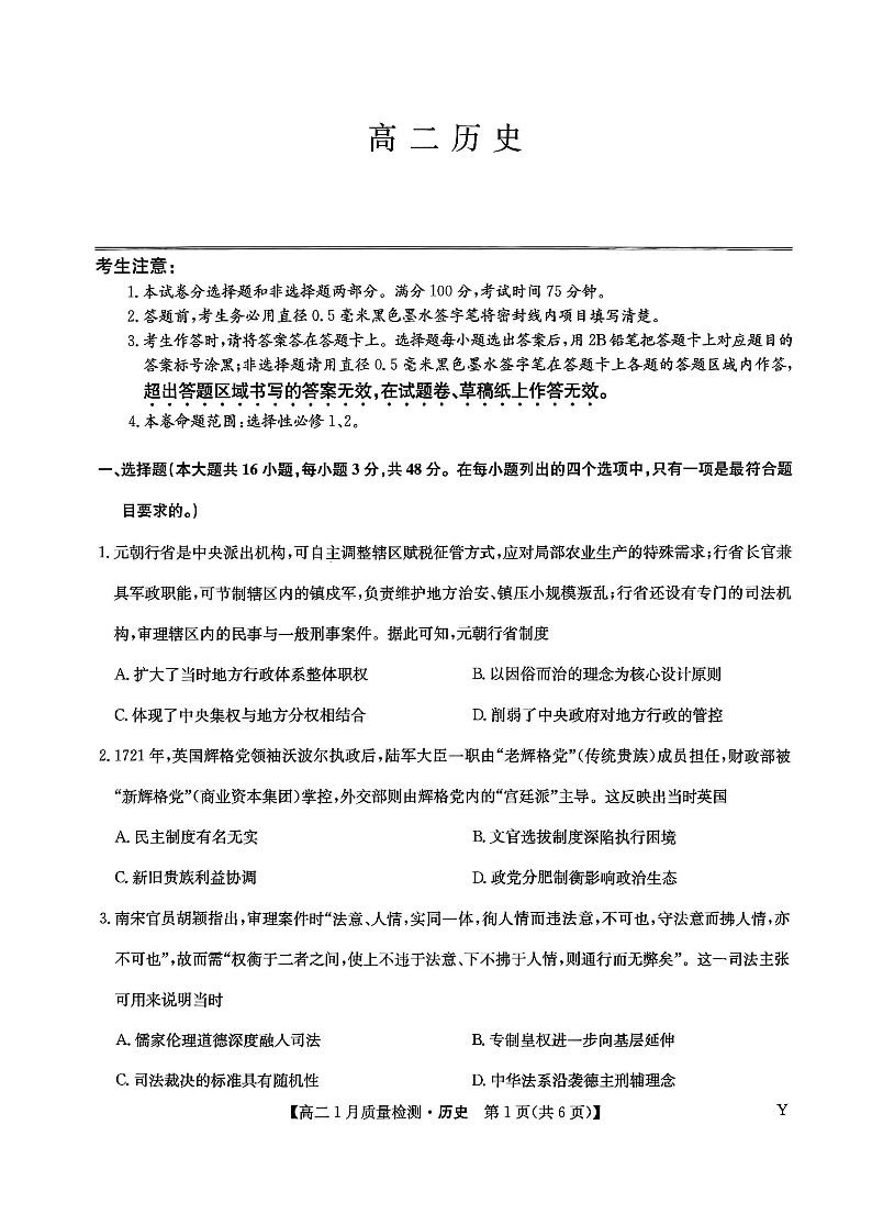 高二历史--甘肃省白银市靖远县第一中学2025-2026学年高二上学期1月期末