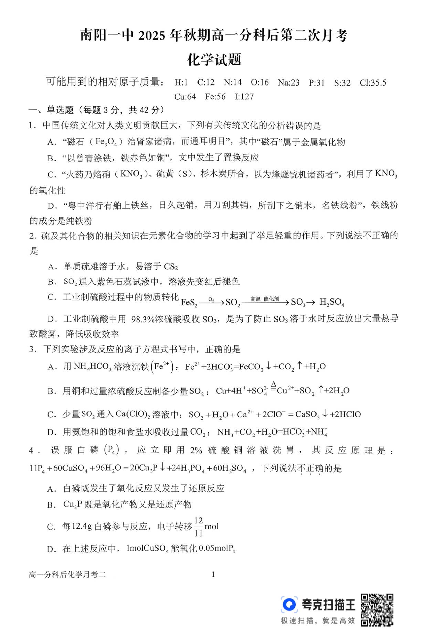 高一化学--河南省南阳市第一中学校2025-2026学年高一上学期分科后第二次月考