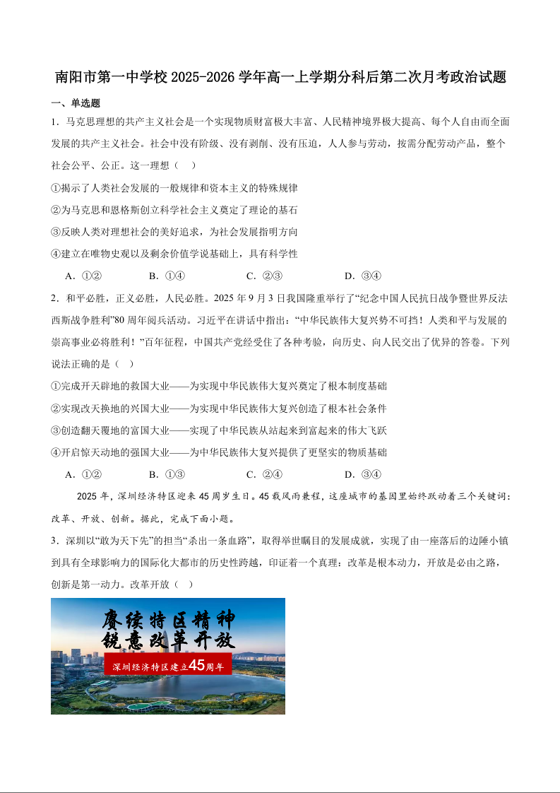 高一政治+答案--河南省南阳市第一中学校2025-2026学年高一上学期分科后第二次月考