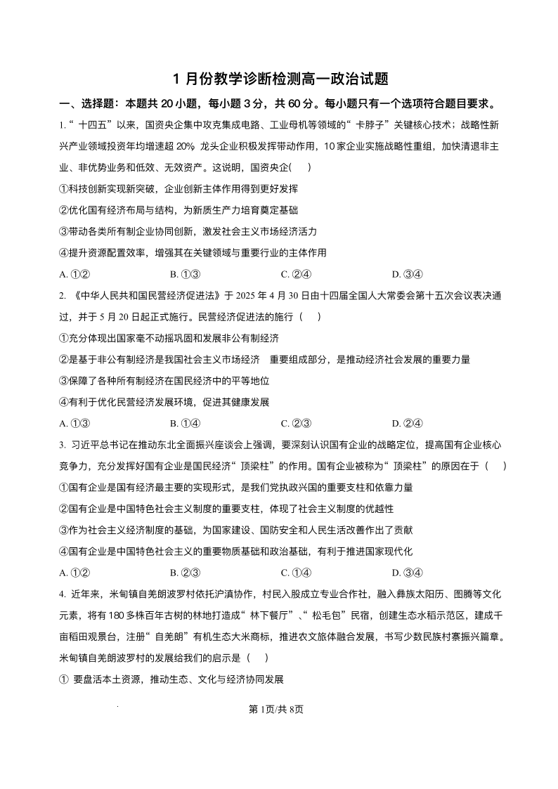 高一政治+答案--山东省菏泽市第一中学2025-2026学年高一上学期1月质量检测