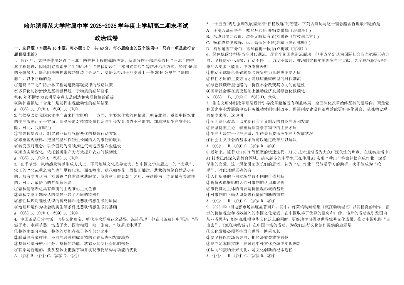 高二政治--黑龙江省哈尔滨师范大学附属中学2025-2026学年高二上学期期末