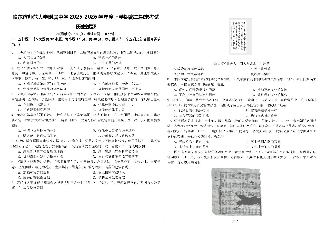 高二历史--黑龙江省哈尔滨师范大学附属中学2025-2026学年高二上学期期末