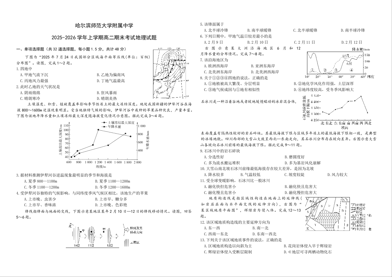 高二地理--黑龙江省哈尔滨师范大学附属中学2025-2026学年高二上学期期末