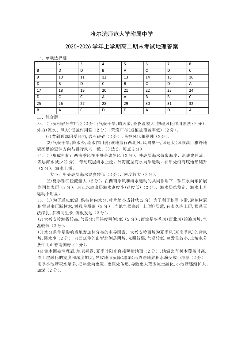 高二地理答案--黑龙江省哈尔滨师范大学附属中学2025-2026学年高二上学期期末
