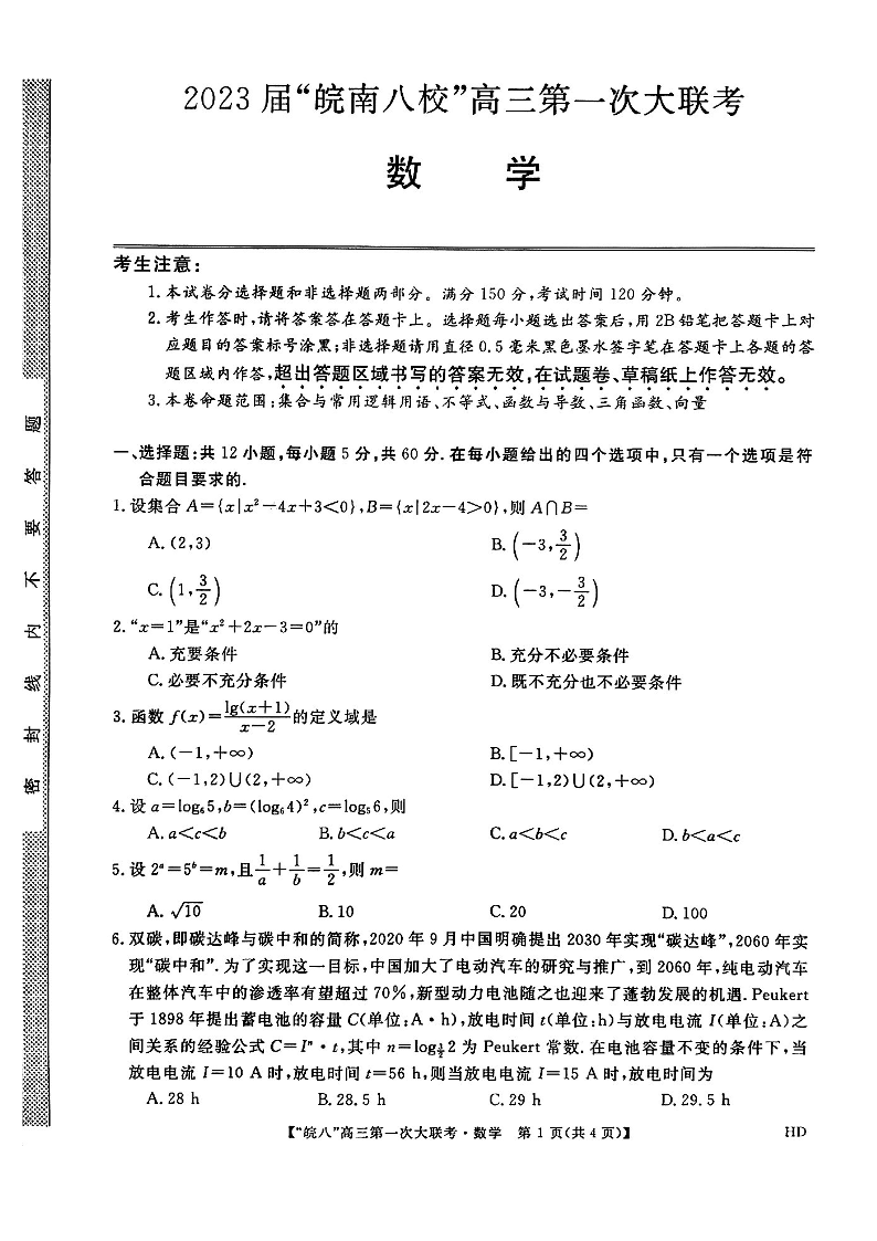 高三数学--安徽省“皖南八校”2023届高三上学期第一次大联考