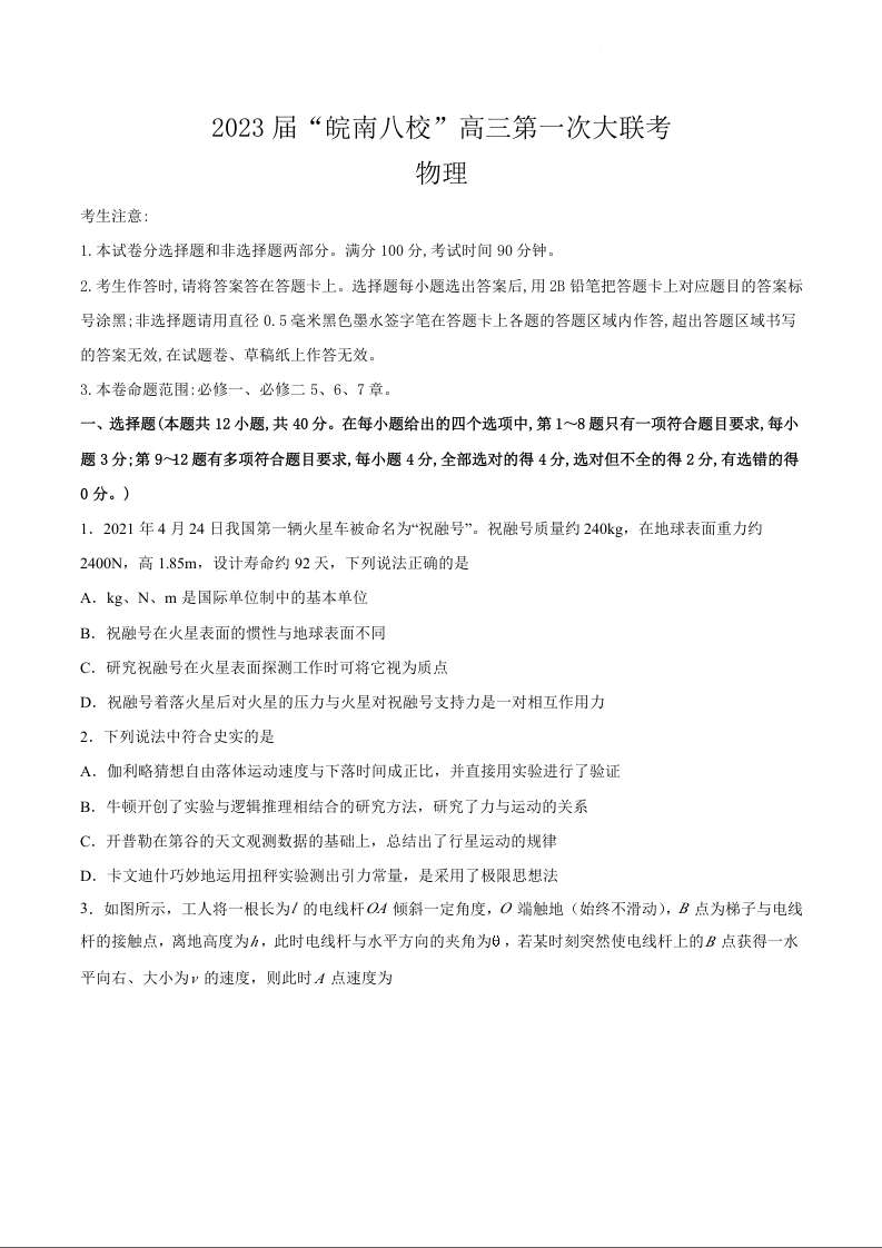 高三物理--安徽省“皖南八校”2023届高三上学期第一次大联考