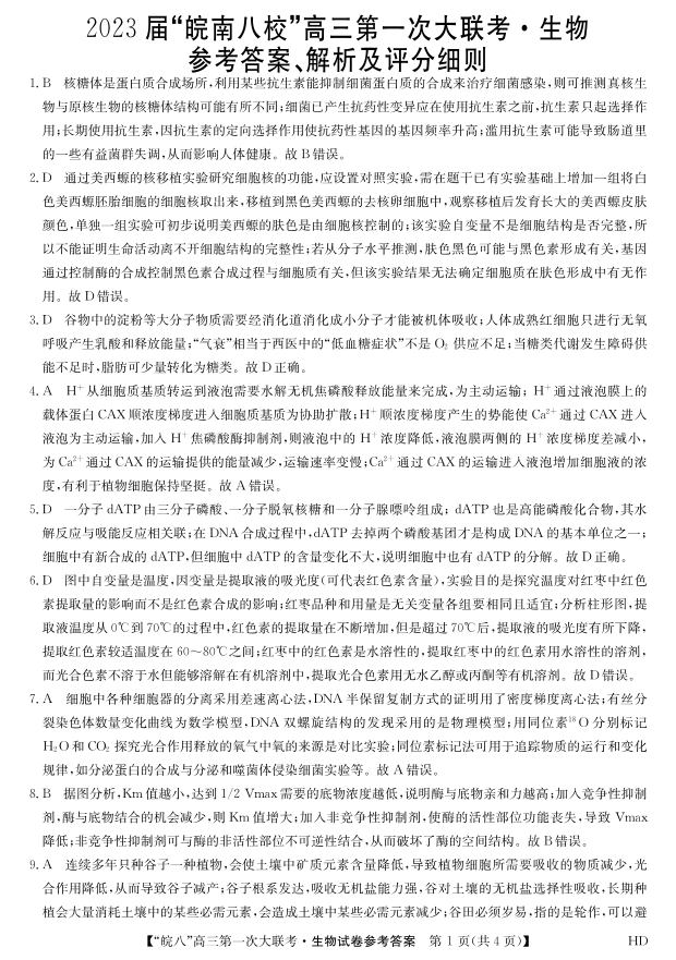 高三生物答案--安徽省“皖南八校”2023届高三上学期第一次大联考
