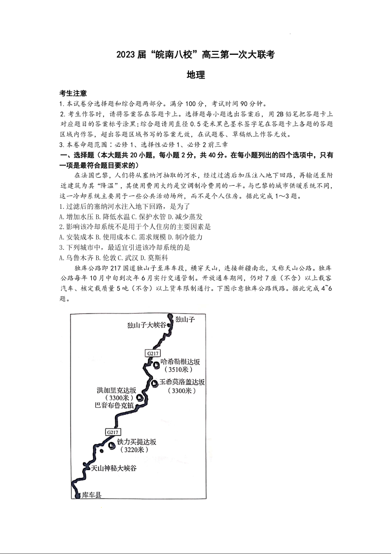 高三地理+答案--安徽省“皖南八校”2023届高三上学期第一次大联考