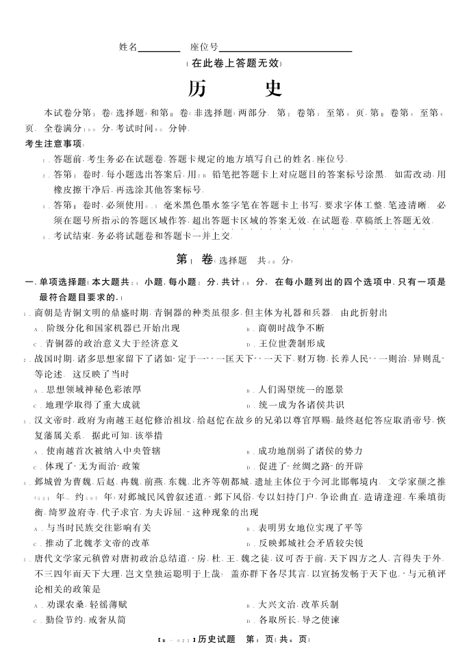 高三历史--安徽省省示范高中2023届高三第二次联考