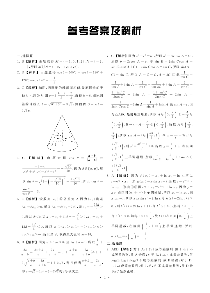 高三数学答案--甘肃省张掖市高三上学期第三次检测