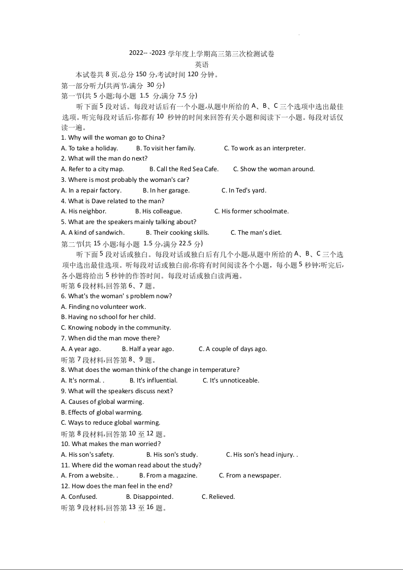 高三英语--甘肃省张掖市高三上学期第三次检测