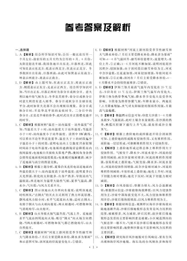 高三地理答案--甘肃省张掖市高三上学期第三次检测
