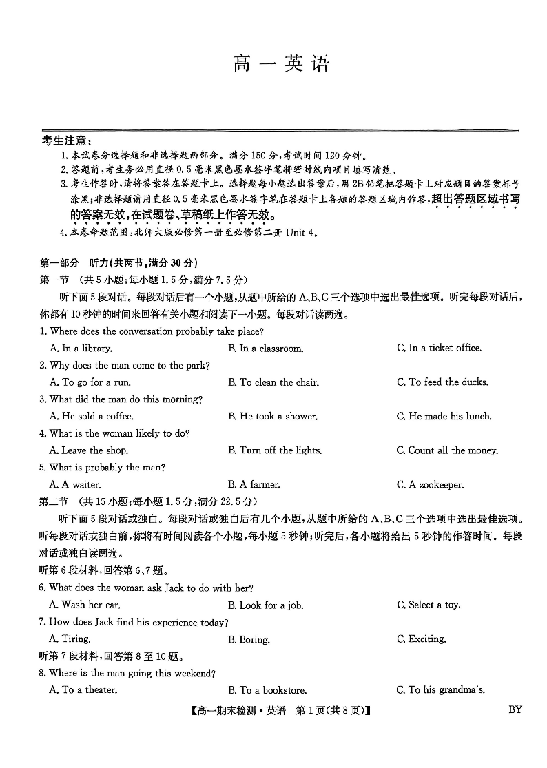 高一英语--甘肃省白银市靖远县第一中学2025-2026学年高一上学期1月期末