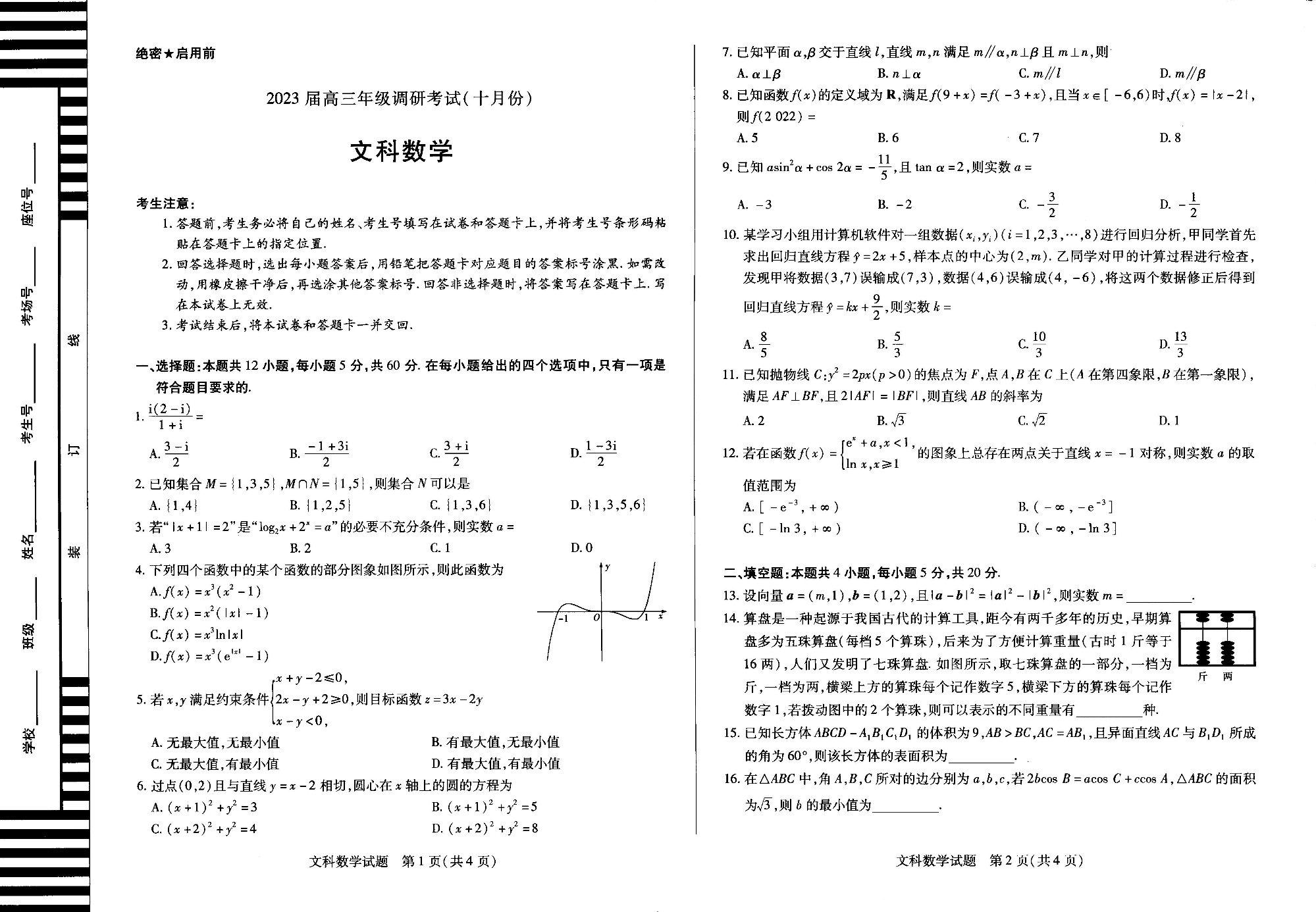 高三文数--河南省安阳市高三上学期毕业班调研考试(10月份)