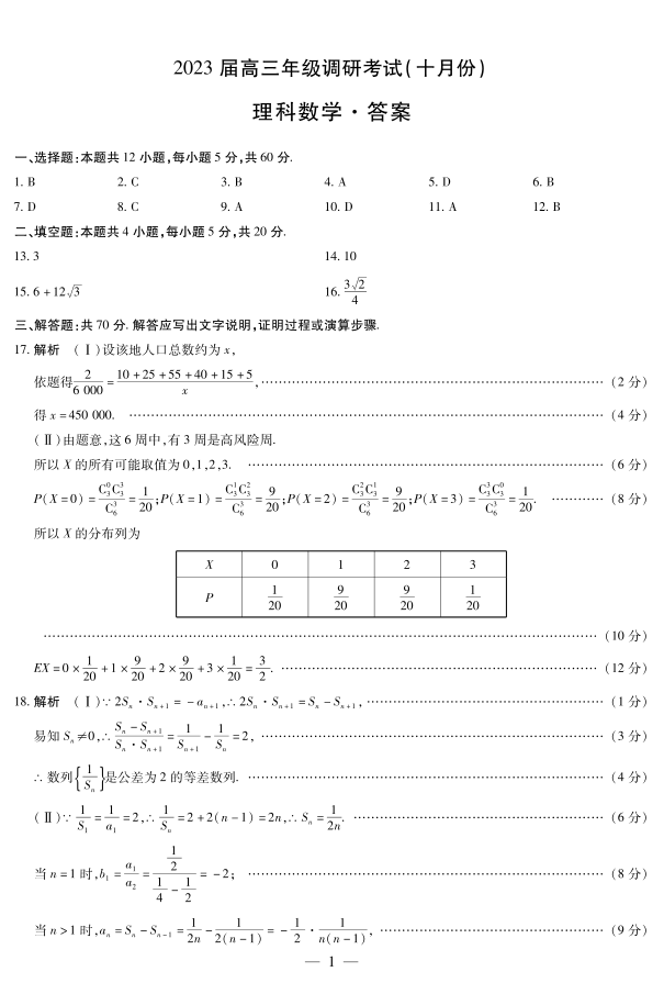 高三理数答案--河南省安阳市高三上学期毕业班调研考试(10月份)