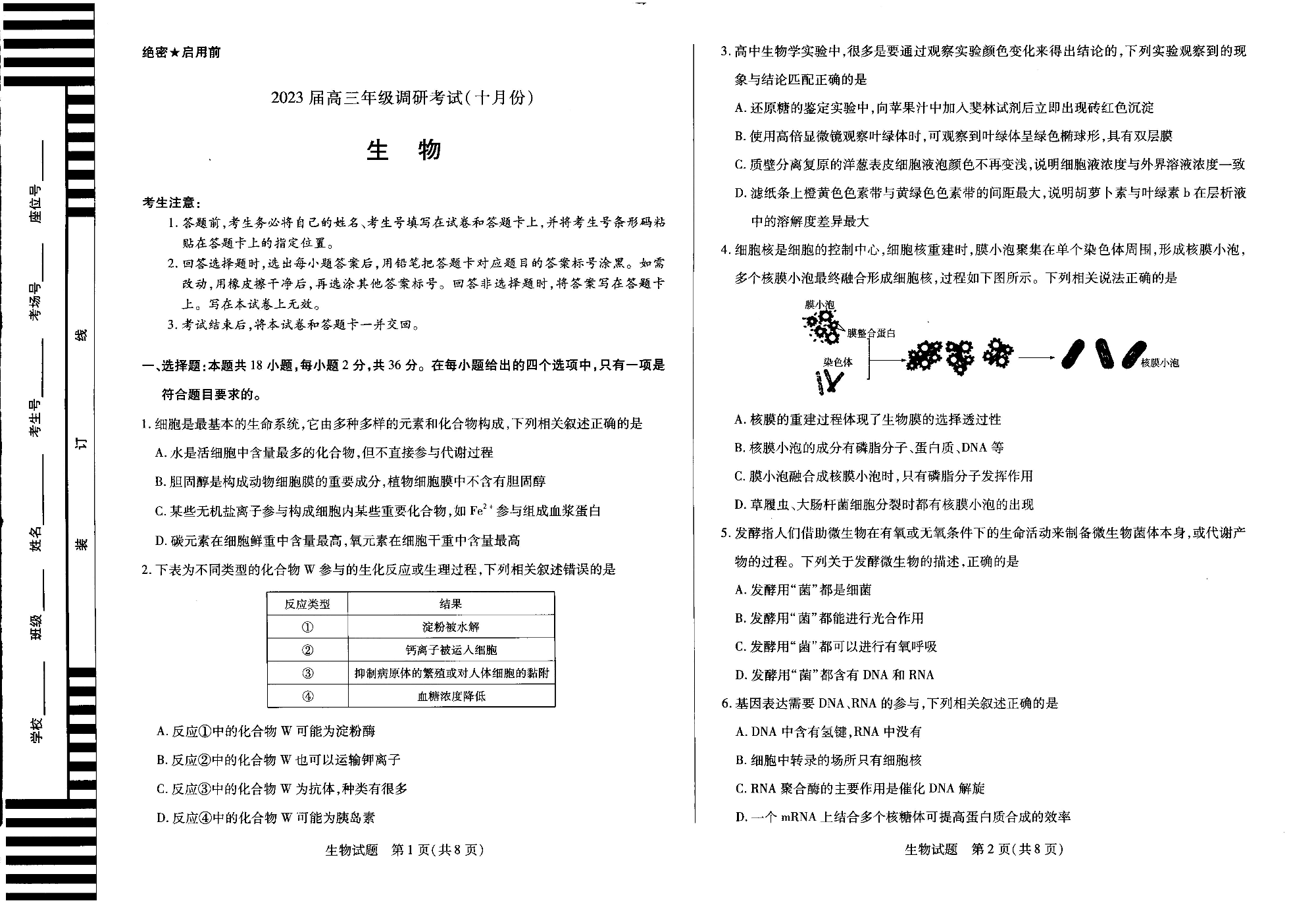 高三生物--河南省安阳市高三上学期毕业班调研考试(10月份)