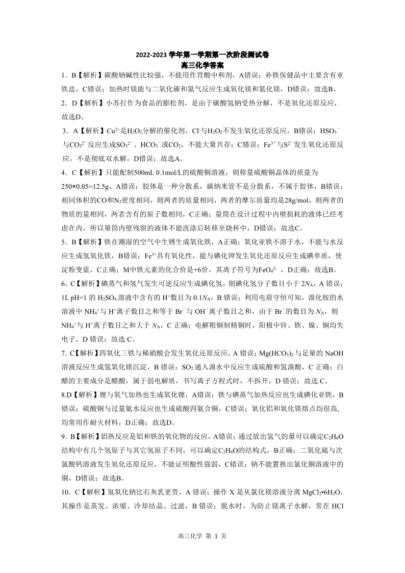 高三化学答案--河南省部分名校2022-2023学年高三上学期第一次阶段测试