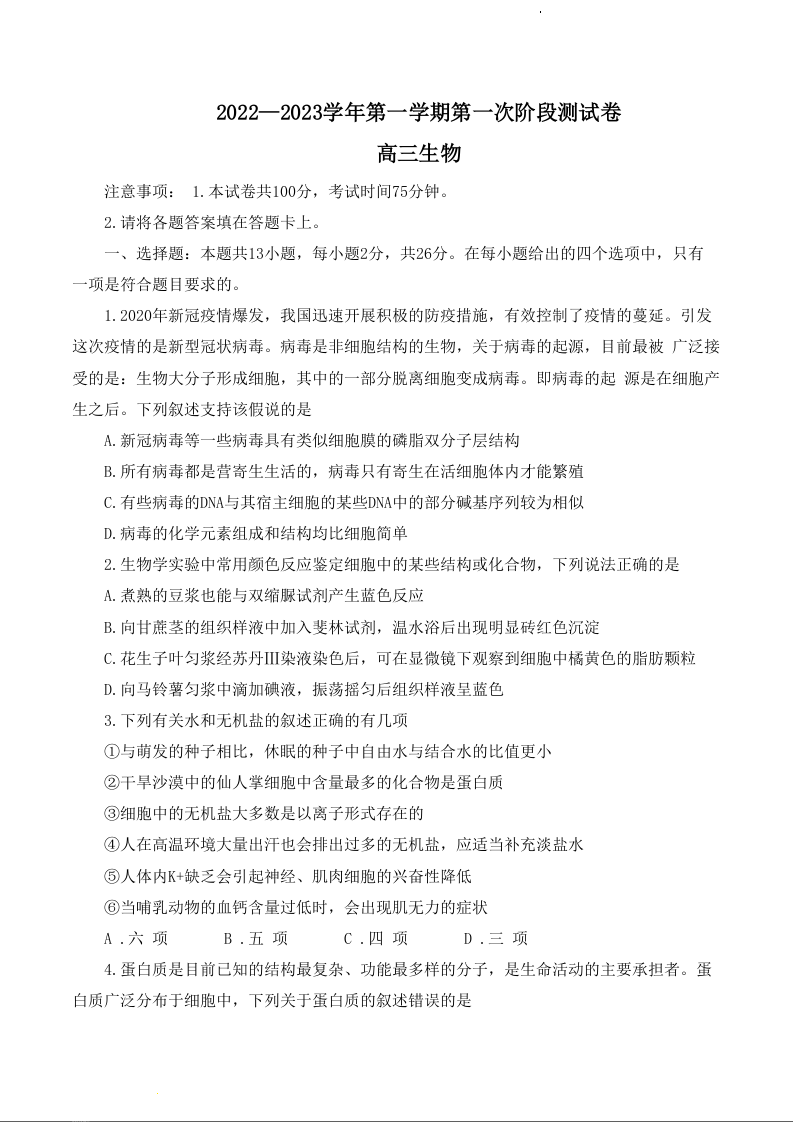 高三生物--河南省部分名校2022-2023学年高三上学期第一次阶段测试