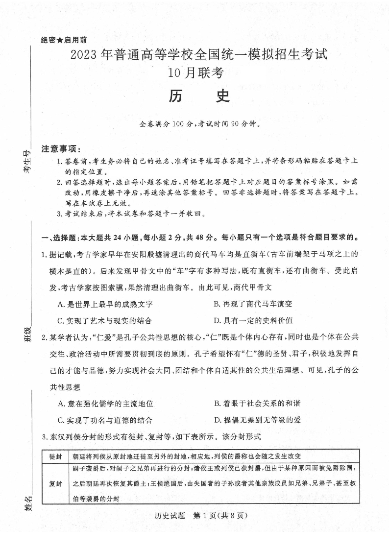 高三历史--河南省名校(新未来)高三上学期2023届10月联考10.28-29