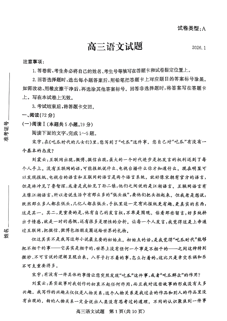 高三语文+答案--山东省滨州市2026届高三上学期1月期末考试