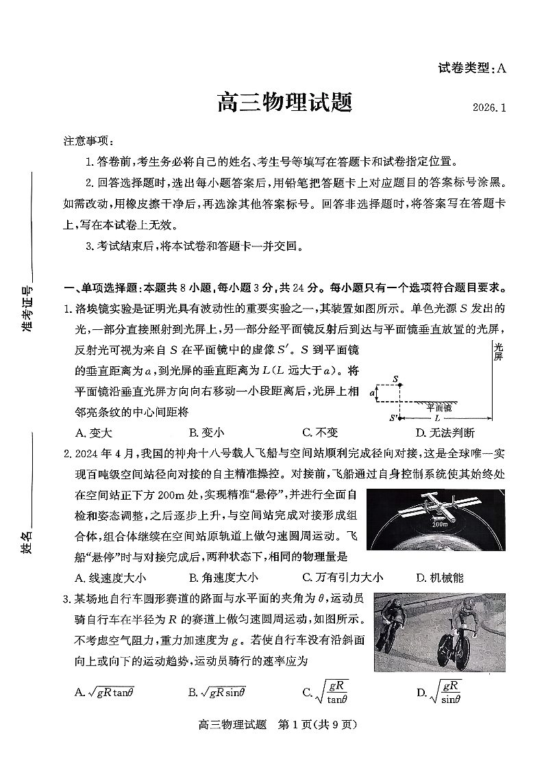 高三物理+答案--山东省滨州市2026届高三上学期1月期末考试