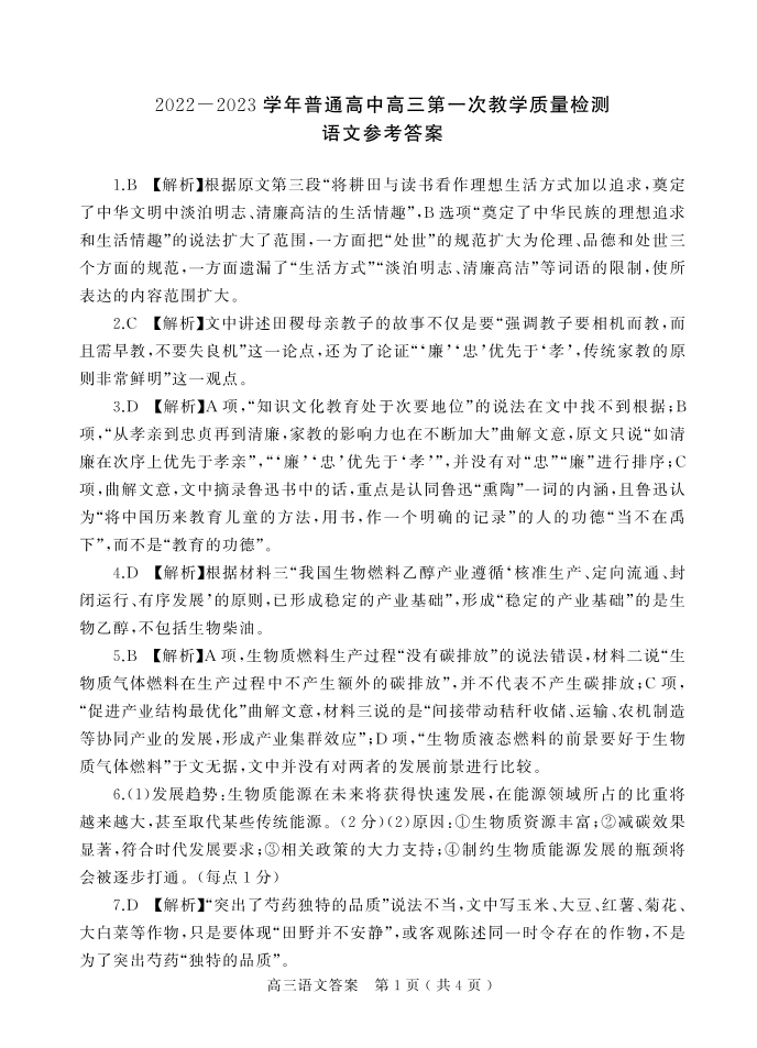 高三语文答案--河南省信阳市普通高中2022-2023学年高三第一次教学质量检测