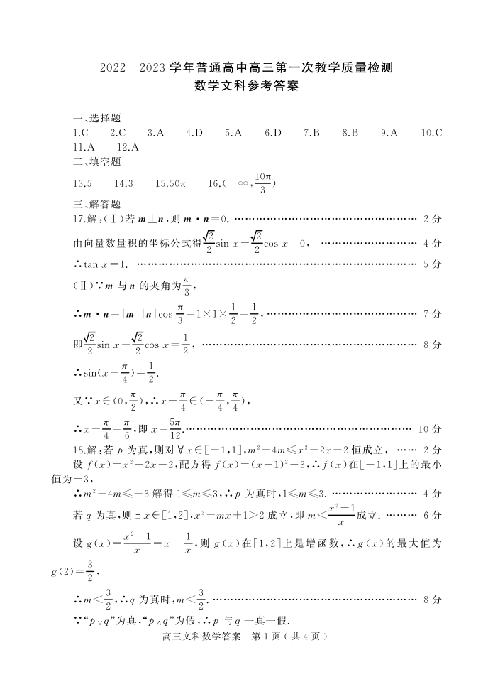 高三文数答案--河南省信阳市普通高中2022-2023学年高三第一次教学质量检测