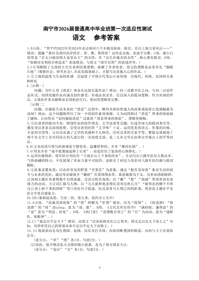 高三语文答案--广西南宁市2026届普通高中毕业班第一次适应性测试(南宁一模)